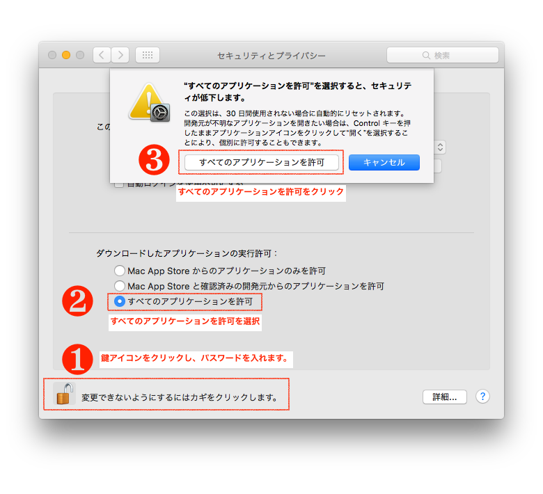 「ダウンロードしたアプリケーションの実行許可」で「すべてのAppを許可する」に設定する必要がある場合があります。