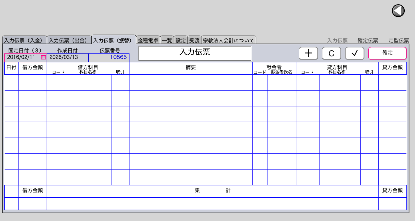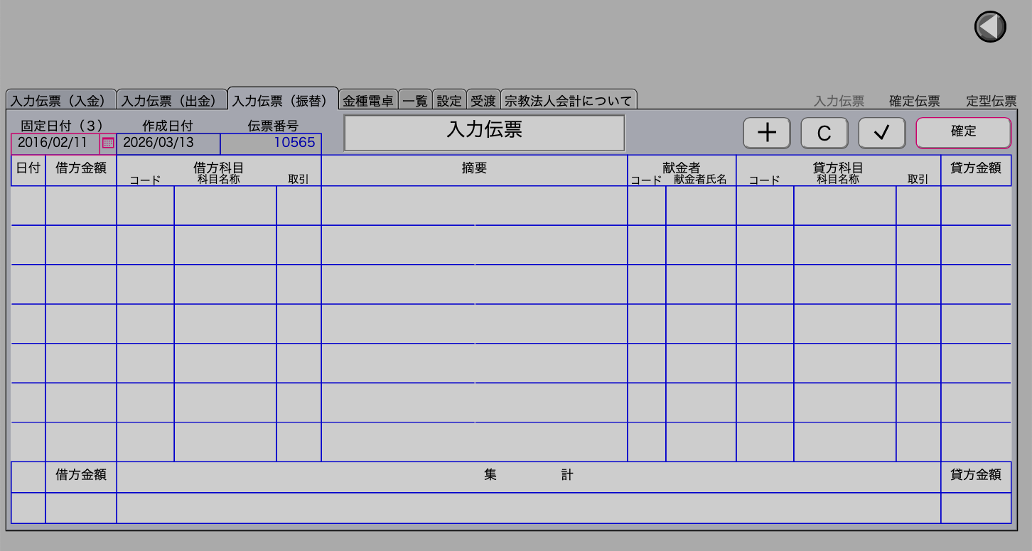 献金の集計時に役立つ、金種別電卓を搭載していませう。この機能は、献金の金種ごとに枚数を数えてから入力すると合計金額を自動的に計算してくれます。その後、合計金額を振替伝票に転送して貼付けることもできます。