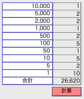 マウスクリックで現金集計計算