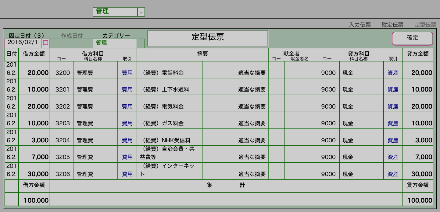 決まった金額の伝票は事前に登録してクリックで確定。