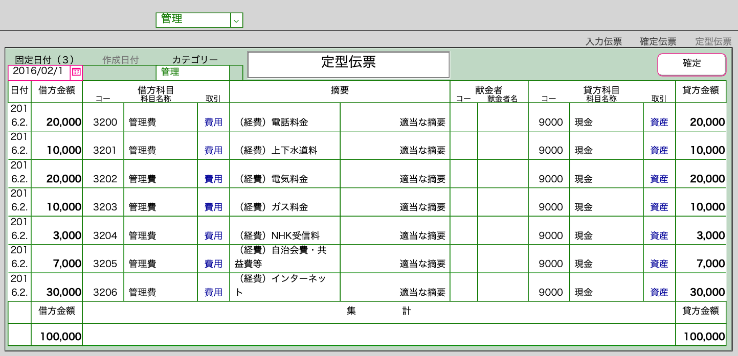 決まった金額の伝票は事前に登録してクリックで確定。